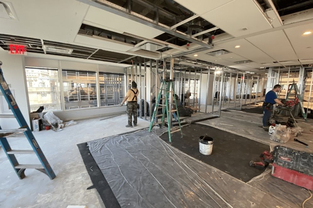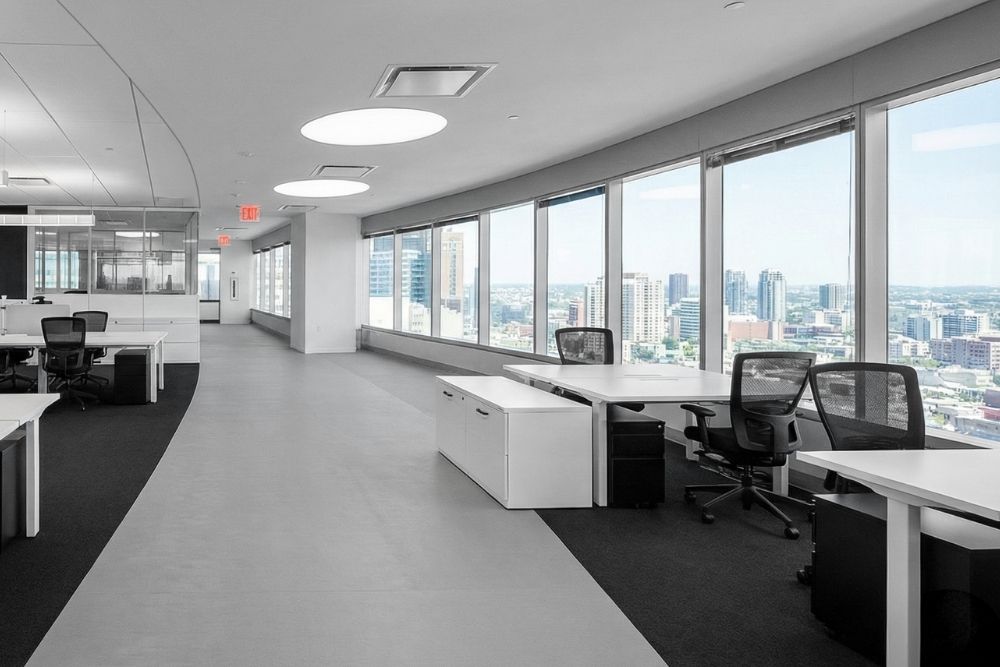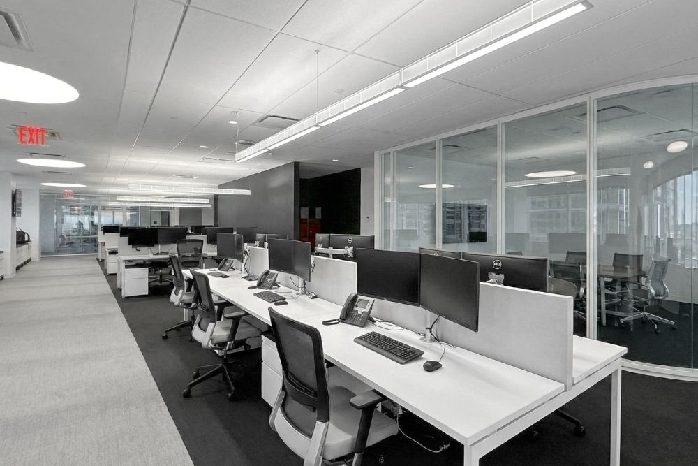 Expansive open work areas are paired with glass-front conference rooms and private offices to maintain transparency, maximize natural light, and support a clean, modern aesthetic throughout the space.