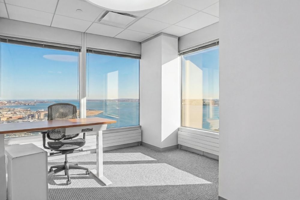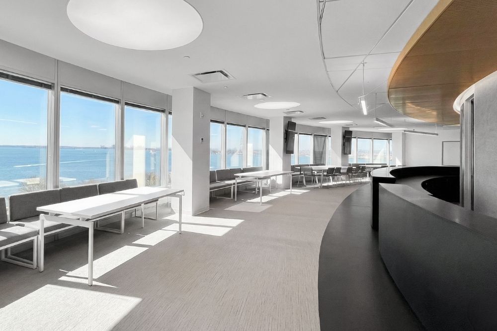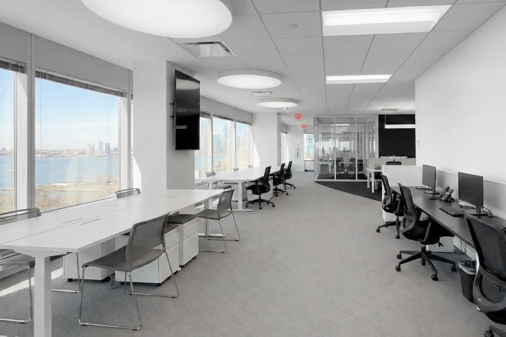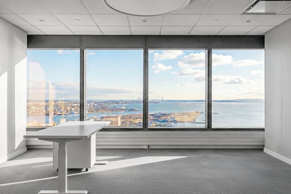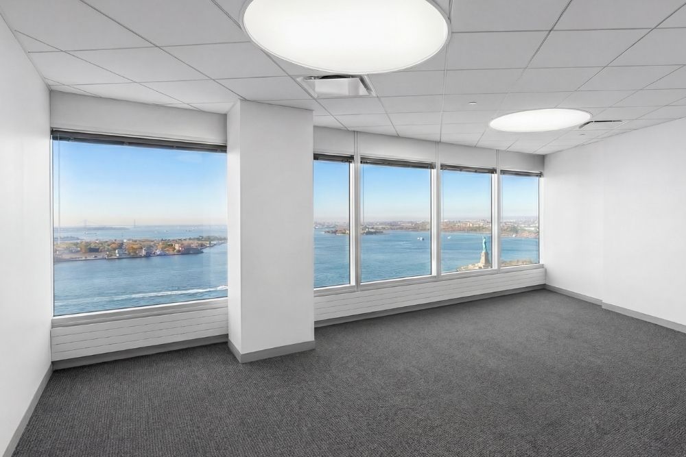 Panoramic windows frame views of the harbor, city skyline, and the Statue of Liberty, grounding the workspace in its iconic Lower Manhattan waterfront location.