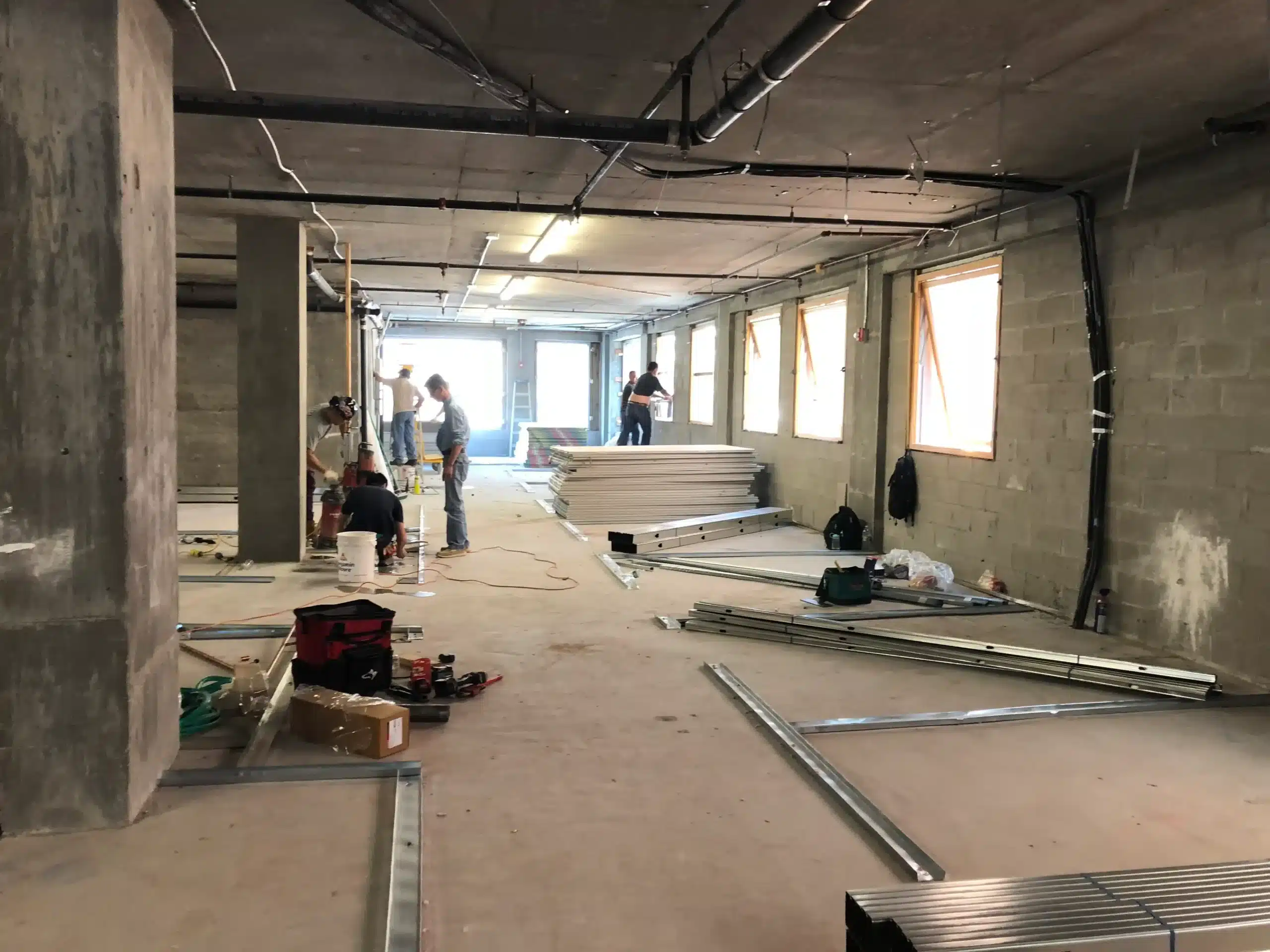 A ground-up office build-out featuring exposed concrete ceilings, custom lighting, full mechanical systems, and integrated millwork.